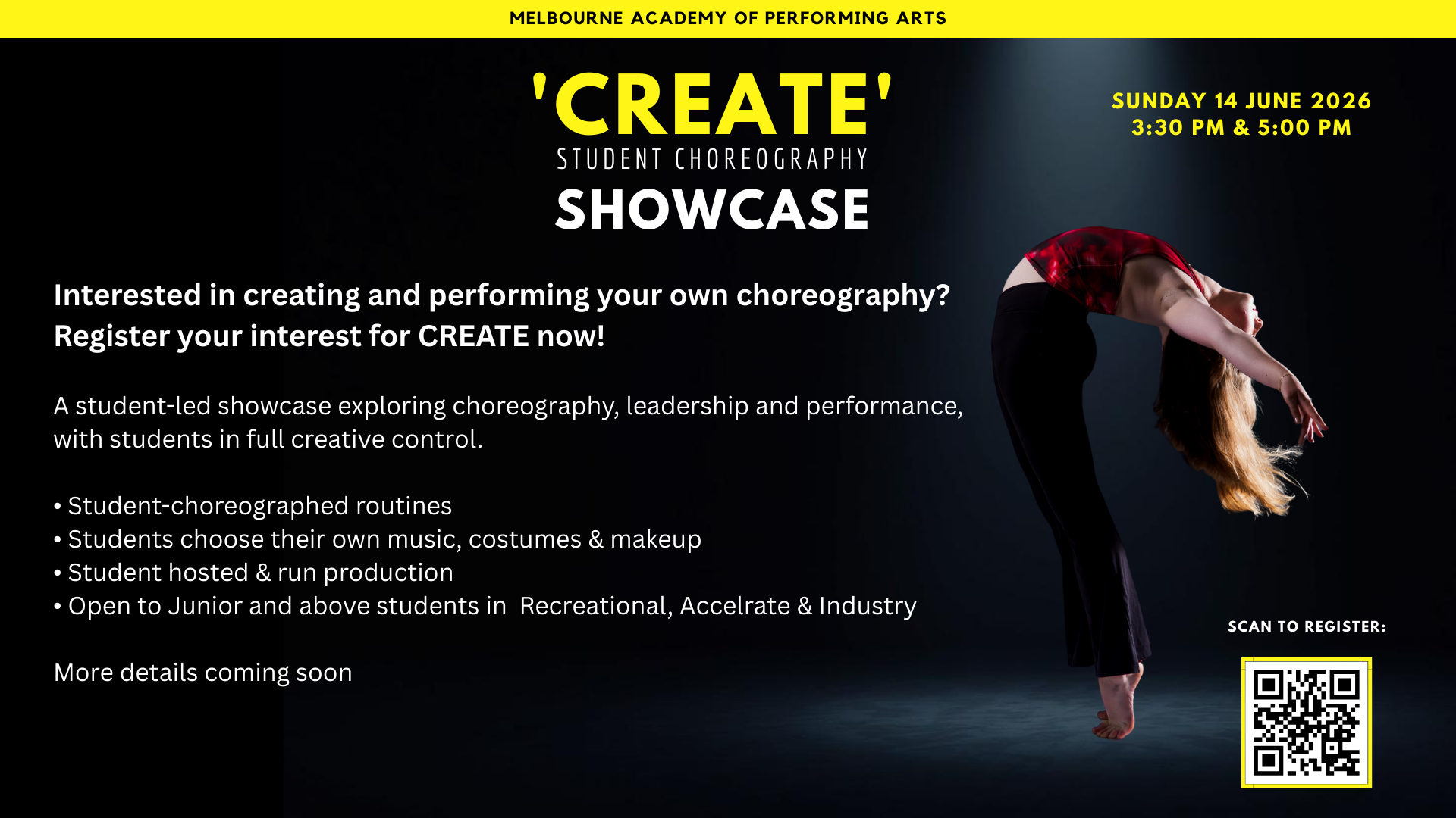 This opportunity is open to all students at MAPA in the Junior, Inter or Senior age groups. Students in MAPA’s Accelerate or Industry programs must present a Solo routine. Students in Junior, Inter or Senior recreational classes can present a solo, duo or trio.